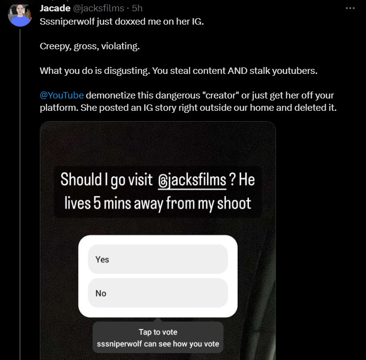La situation entre Jacksfilms et Sssniperwolf vient de prendre un nouveau tournant, assez grave. Sssniperwolf étant apparemment exaspérée d'être critiquée par Jacksfilms s'est rendue vers chez lui il y a quelques heures et a filmé l'extérieur de sa maison pour le montrer à ses millions d'abonnés sur Instagram (voir les tweets ci-dessus)... 😡 Elle a détruit la vidéo depuis, mais ça commence à aller trop loin cette histoire.